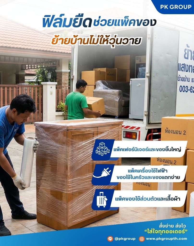 ฟิล์มยืดคือผู้ช่วยคนสำคัญในการย้ายบ้าน เพราะมีความเหนียว ยืดหยุ่น และเกาะติดกันเองโดยไม่ต้องใช้กาว ช่วยรวมของชิ้นเล็กชิ้นน้อยเข้าด้วยกัน ป้องกันเฟอร์นิเจอร์เป็นรอย และทำให้การขนย้ายเป็นระเบียบและปลอดภัยยิ่งขึ้น