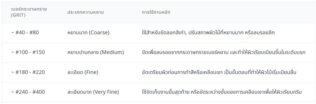 การเลือกเบอร์กระดาษทรายที่เหมาะสมกับแต่ละขั้นตอนคือกุญแจสู่ความสำเร็จ ตัวเลขบนกระดาษทรายยิ่งน้อยหมายถึงยิ่งหยาบ และตัวเลขยิ่งมากหมายถึงยิ่งละเอียด